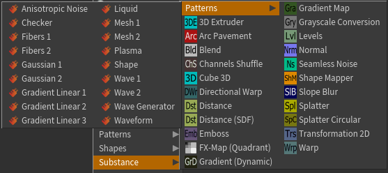 It provides you with 13 most powered atomic Substance Designer-like nodes: Blend, Channels Shuffle, Directional Warp, Distance, Gradient (Dynamic), FX-Map, Gradient Map, Grayscale Conversion, Levels, Normal, Transformation 2D, Warp and Emboss. Also, you can use many other nodes from Substance Designer (Arc Pavement, Checker, Cube 3D, Splatter, Splatter Circular, Tile, Tile Generator, Fibers, Gaussian, Gradient Linear, Mesh, Shape, Shape Mapper, Slope Blur, Waveform, Fluid, Liquid, Weave 1, Weave 2, Weave Generator).